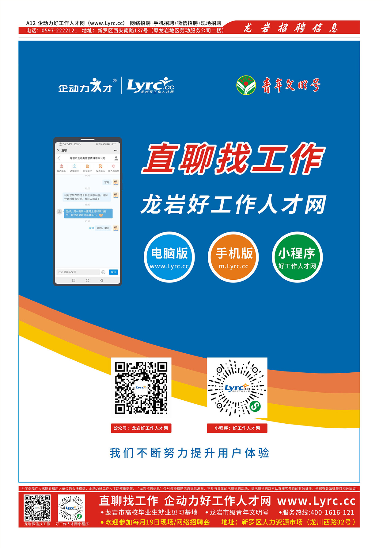 本網(wǎng)站經(jīng)福建省龍巖市人社局批準(zhǔn),為正規(guī)合法人才網(wǎng)站,人力資源服務(wù)許可證:350800RL0019