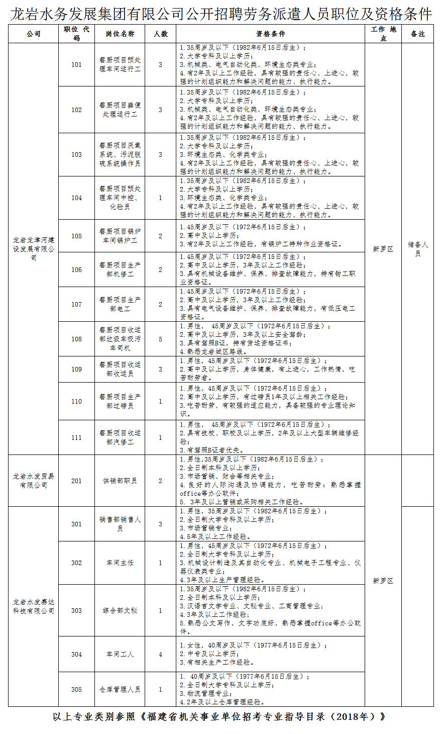 詳見附件《龍巖水務(wù)發(fā)展集團(tuán)有限公司公開招聘勞務(wù)派遣人員職位及資格條件》