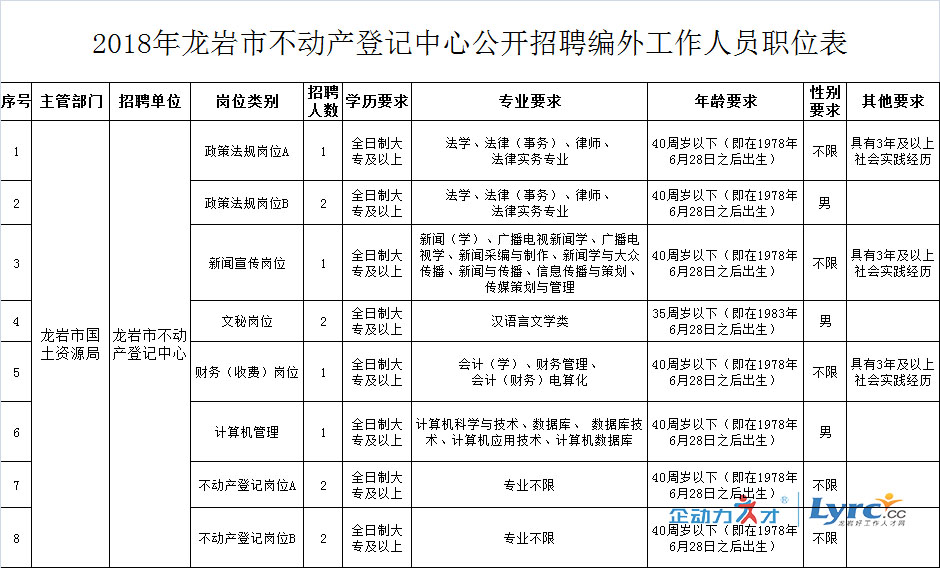 本次公開招聘12名編外工作人員,具體要求詳見《2018年龍巖市不動產(chǎn)登記中心公開招聘編外工作人員職位表》(附件1)。