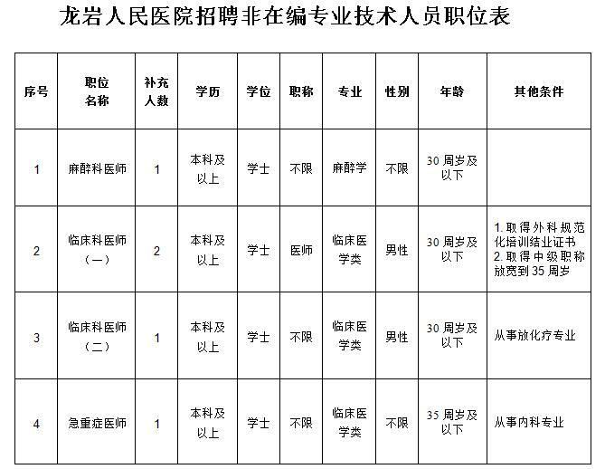 本次公開招聘非在編工作人員5名,具體的招聘職位、招聘人數(shù)及職位資格條件等,詳見《龍巖人民醫(yī)院公開招聘非在編工作人員職位表》(見附件1)。