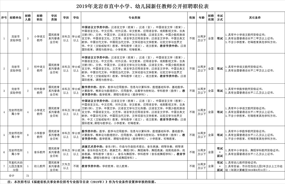 各職位的具體要求,詳見(jiàn)附件《2019年龍巖市直中小學(xué)幼兒園新任教師公開(kāi)招聘職位表》(以下簡(jiǎn)稱《職位表》)。