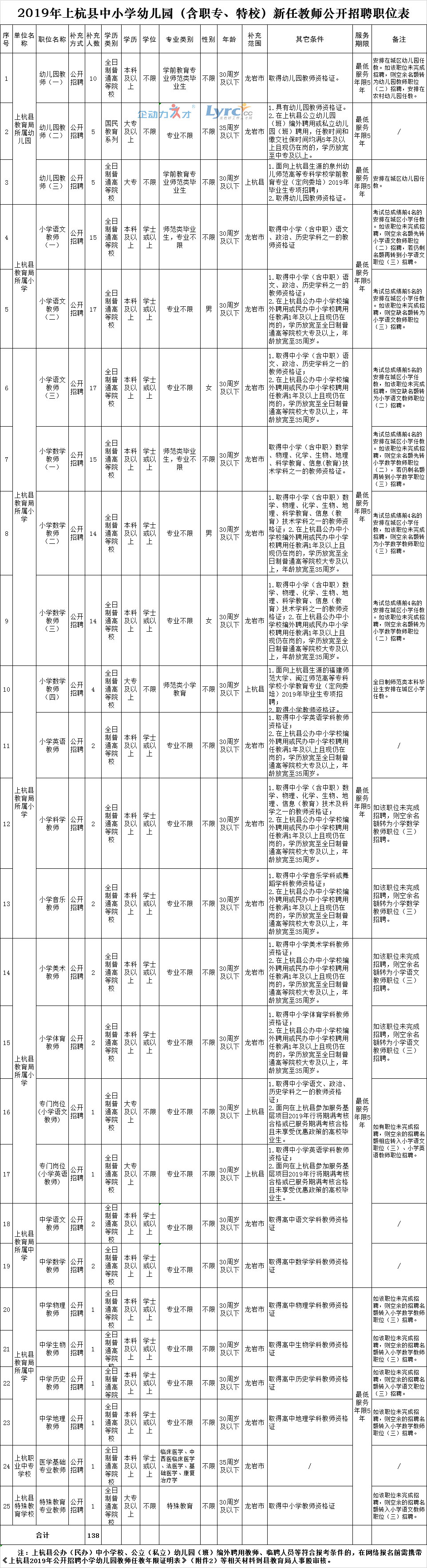全縣本次公開招聘職位25個(gè),計(jì)劃招聘人數(shù)138人, 其中:幼兒園教師20名,小學(xué)教師108名,中學(xué)教師8名,職業(yè)中專專業(yè)教師1名,特殊教育學(xué)校教師1名,均為事業(yè)單位編制內(nèi)招聘。具體的招聘職位、人數(shù)及任職條件要求等詳見《2019年上杭縣中小學(xué)幼兒園(含職專、特校)新任教師公開招聘職位表》(附件1)。