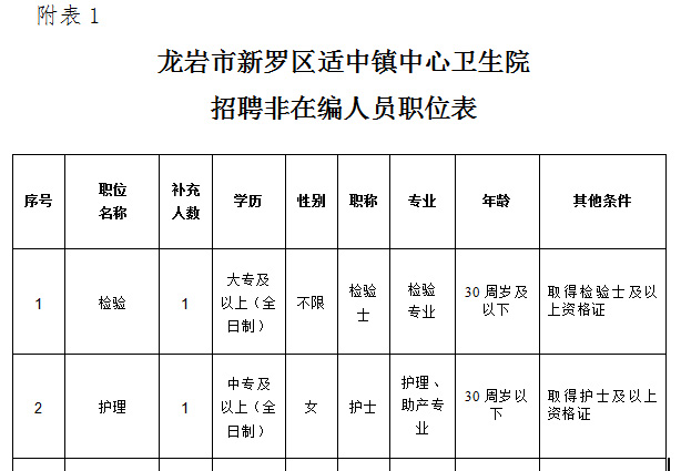 本次公開招聘非在編人員2名,具體的招聘職位、招聘人數(shù)及職位資格條件等,詳見《龍巖市新羅區(qū)適中鎮(zhèn)中心衛(wèi)生院公開招聘非在編人員職位表》(見附件1)。