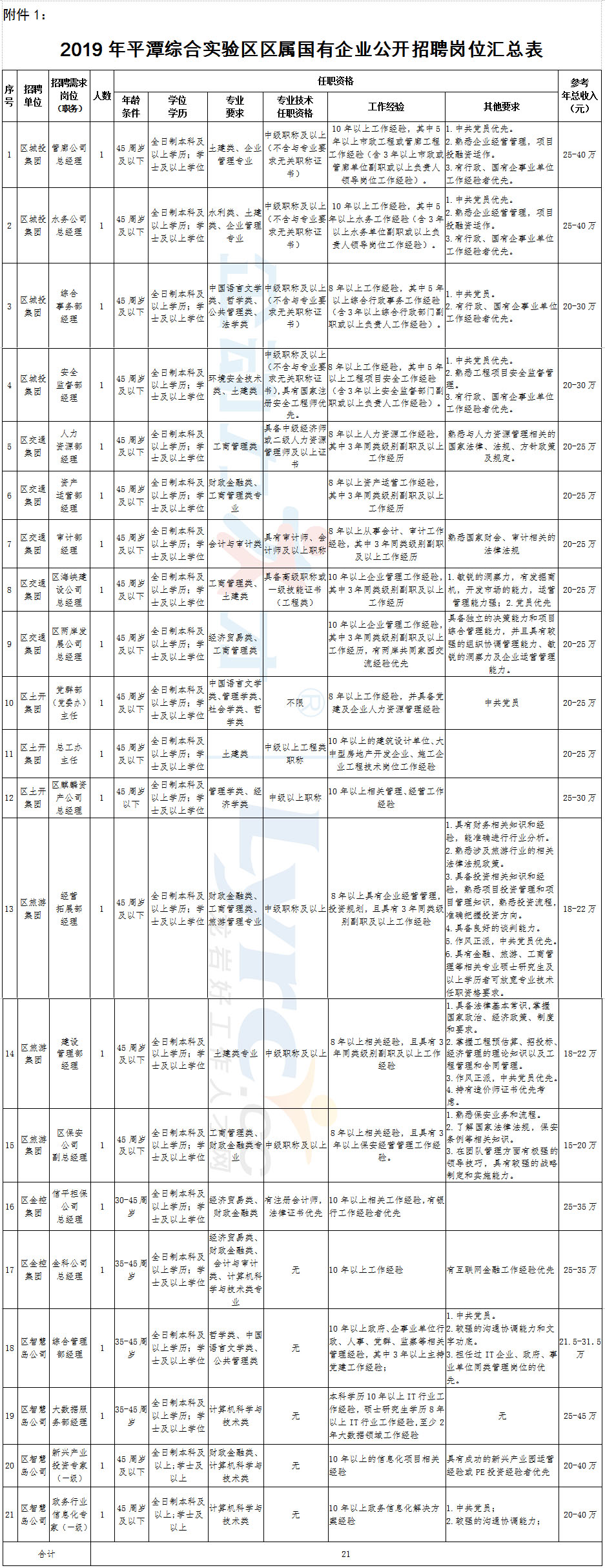 本次招聘共21個崗位,各崗位具體招聘人數(shù)、任職要求及薪酬情況詳見《2019年平潭綜合實驗區(qū)區(qū)屬國有企業(yè)公開招聘崗位匯總表》(附件1)。