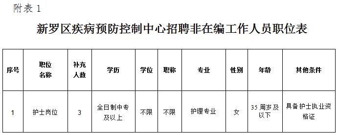 護(hù)士3人,年齡35周歲以下(1984年5月5日以后出生);具體條件詳見《新羅區(qū)疾病預(yù)防控制中心公開招聘非在編人員職位表》(見附件1)。
