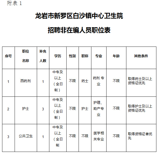 附件1:龍巖市新羅區(qū)白沙鎮(zhèn)中心衛(wèi)生院招聘非在編人員職位表(點擊下載)