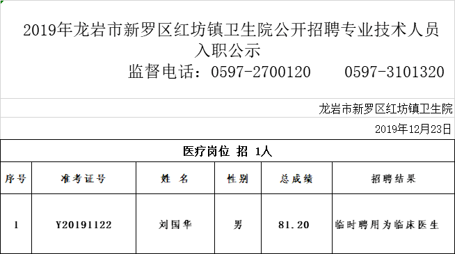 您當(dāng)前的位置:首頁 > 新羅區(qū)國有企事業(yè) > 【入職公示】2019年龍巖市新羅區(qū)紅坊鎮(zhèn)衛(wèi)生院公開招聘專業(yè)技術(shù)人員入職公示