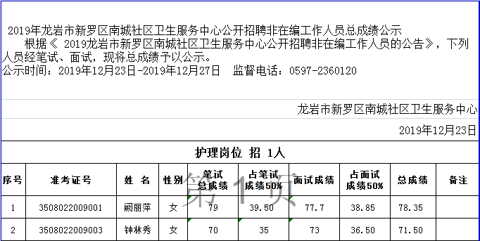 您當(dāng)前的位置:首頁 > 新羅區(qū)國有企事業(yè) > 【成績公示】2019年龍巖市新羅區(qū)南城衛(wèi)生服務(wù)中心公開招聘非在編工作人員總成績公示