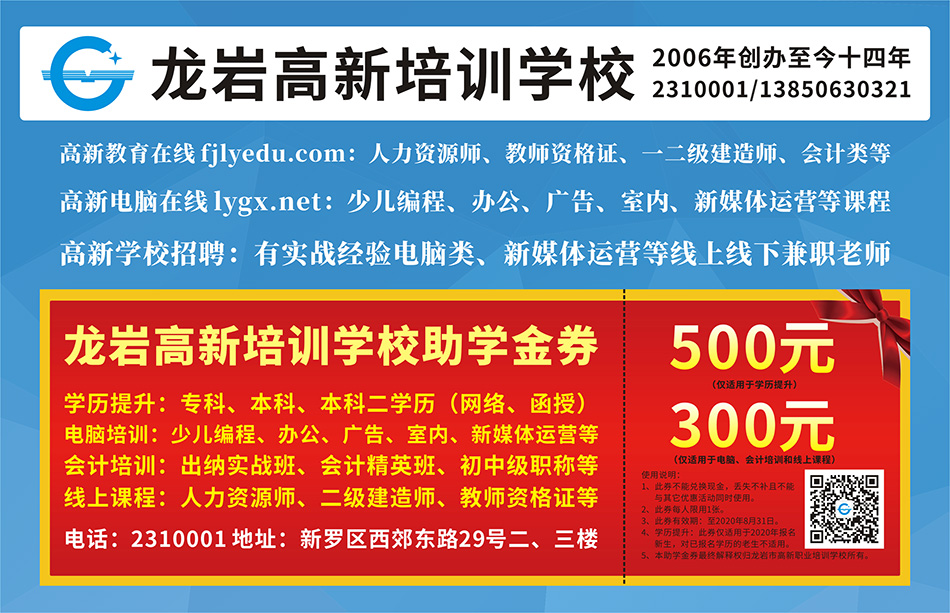 龍巖高新培訓(xùn)學(xué)校(2006-4-27至今)!龍巖市高新職業(yè)培訓(xùn)學(xué)校創(chuàng)辦2006年,是經(jīng)福建省龍巖市新羅區(qū)人力資源和社會保障局批準的一所專業(yè)從事電腦、會計、人力資源管理師等專業(yè)培訓(xùn)學(xué)校。