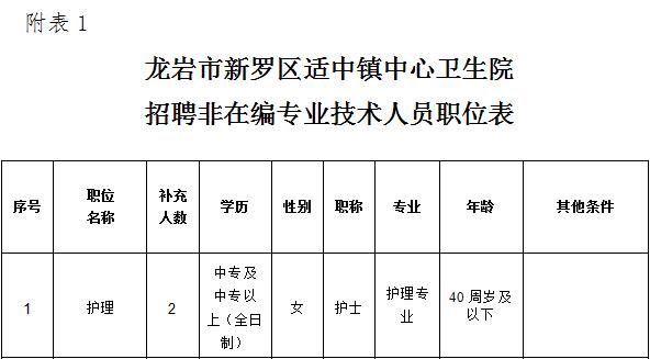 《龍巖市新羅區(qū)適中鎮(zhèn)中心衛(wèi)生院公開(kāi)招聘非在編護(hù)士人員職位表》(點(diǎn)擊下載)