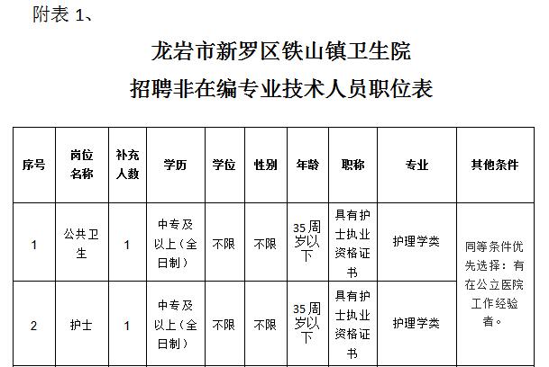 附表1:龍巖市新羅區(qū)鐵山鎮(zhèn)衛(wèi)生院招聘非在編專(zhuān)業(yè)技術(shù)人員職位表