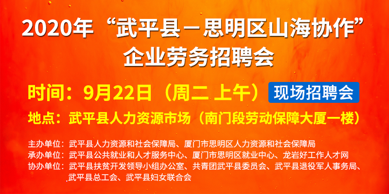 • 【9月22招聘會(huì)】2020年“武平縣-思明區(qū)山海協(xié)作”企業(yè)勞務(wù)招聘會(huì)