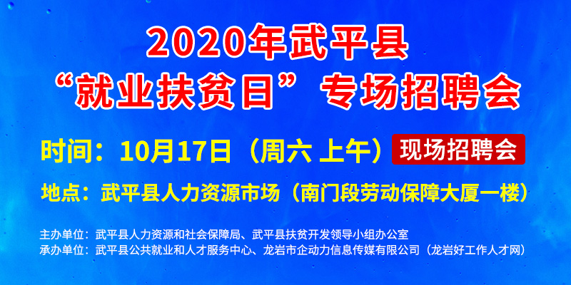 • 【10月17武平招聘會】2020年武平縣“就業(yè)扶貧日”專場招聘會