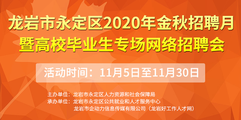 • 龍巖市永定區(qū)2020年金秋招聘月暨高校畢業(yè)生專場網(wǎng)絡(luò)招聘會