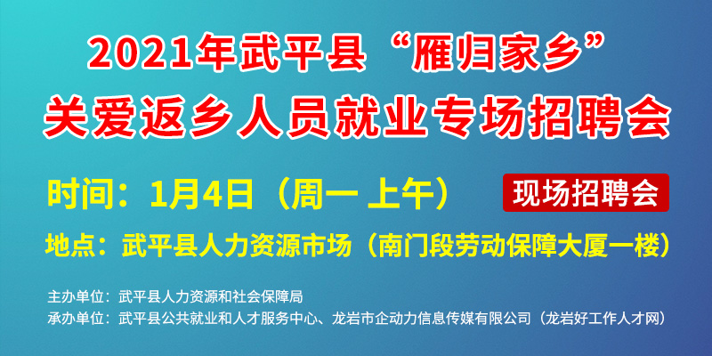 您當(dāng)前的位置:首頁(yè) > 武平國(guó)有企事業(yè) > 【1月4日武平招聘會(huì)】2021年武平縣“雁歸家鄉(xiāng)”關(guān)愛(ài)返鄉(xiāng)人員就業(yè)專場(chǎng)招聘會(huì)