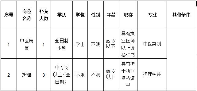 •  為充實(shí)我中心專業(yè)人才隊(duì)伍,根據(jù)《事業(yè)單位人事管理?xiàng)l例》、《事業(yè)單位公開招聘人員暫行規(guī)定》,經(jīng)研究決定公開招聘非在編中醫(yī)康復(fù)1名、護(hù)理人員3名,F(xiàn)將招聘工作有關(guān)事項(xiàng)公告如下: