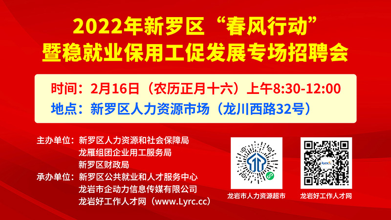 歡迎參加2022年新羅區(qū)“春風(fēng)行動(dòng)”暨穩(wěn)就業(yè)保用工促發(fā)展專場(chǎng)招聘會(huì)【第三場(chǎng):正月十六上午】