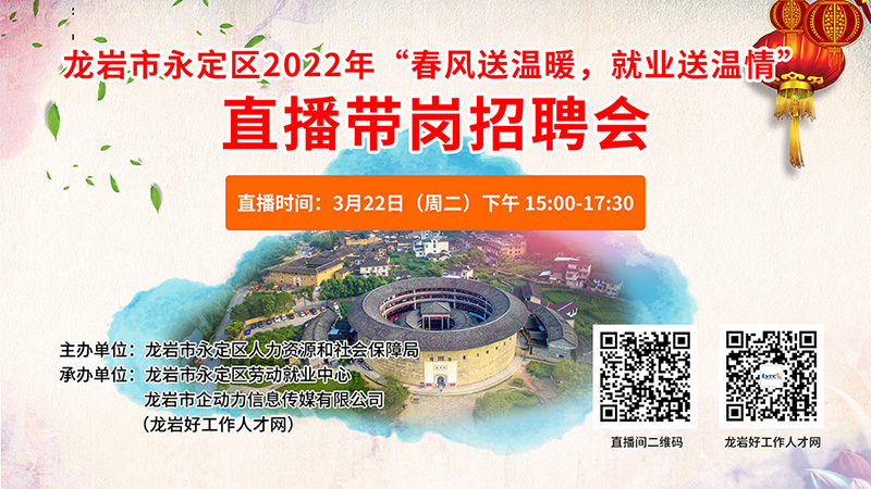 您當(dāng)前的位置:首頁(yè) > 新聞動(dòng)態(tài) > 【直播回放】龍巖市永定區(qū)2022年“春風(fēng)送溫暖,就業(yè)送溫情”直播帶崗招聘會(huì)