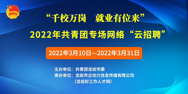 •     為落實黨中央、國務(wù)院“六穩(wěn)”“六保”決策部署,深入貫徹2022年全國教育工作重要指示精神,全力推進(jìn)高校畢業(yè)生就業(yè)工作。深挖就業(yè)資源、拓寬就業(yè)渠道、促進(jìn)網(wǎng)絡(luò)招聘市場建設(shè),提供就業(yè)“云服務(wù)”,為高校畢業(yè)生和用人單位搭建供需橋梁,妥善幫助畢業(yè)生順利就業(yè)。共青團(tuán)龍巖市委員會擬舉辦“千校萬崗,就業(yè)有位來”2022年共青團(tuán)專場網(wǎng)絡(luò)“云招聘”,具體方案如下:
