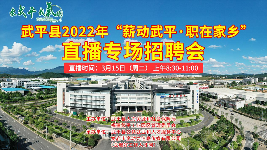•  2022年3月15日,由武平縣人力資源和社會(huì)保障局及福建武平工業(yè)園區(qū)管理委員會(huì)主辦,武平縣公共就業(yè)人才服務(wù)中心及龍巖市企動(dòng)力信息傳媒有限公司(龍巖企動(dòng)力好工作人才網(wǎng))承辦的2022年“薪動(dòng)武平·職在家鄉(xiāng)”直播帶崗招聘會(huì)圓滿完成。