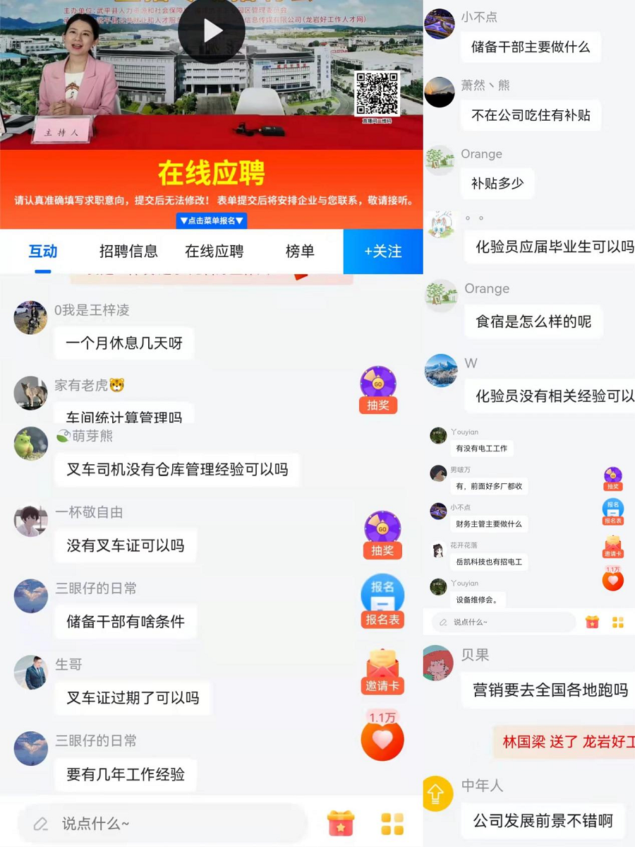 雙向選擇才是圓滿,當(dāng)天直播間內(nèi)氣氛熱烈,HR與求職者積極活躍在留言區(qū)互動(dòng),了解企業(yè)及崗位相關(guān)咨詢,并有驚喜紅包雨和抽獎(jiǎng)環(huán)節(jié),短短兩個(gè)半小時(shí)的直播里,干貨滿滿,也讓部分求職者達(dá)成求職意向,在留言區(qū)表示心動(dòng)躍躍欲試!