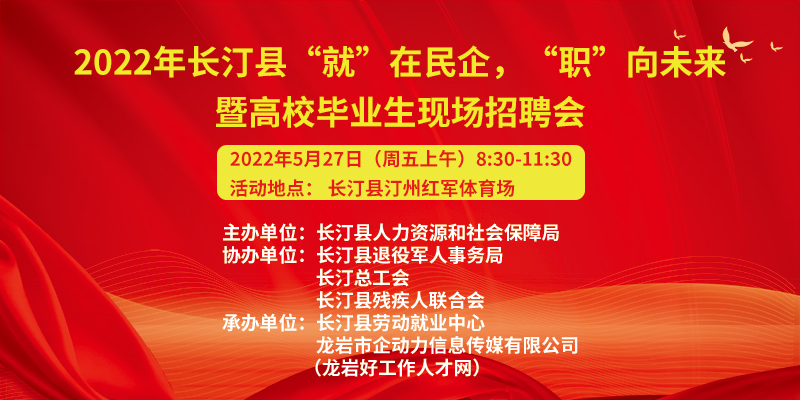 • 歡迎參加2022年長(zhǎng)汀縣 “就”在民企,“職”向未來(lái)暨高校畢業(yè)生現(xiàn)場(chǎng)招聘會(huì)