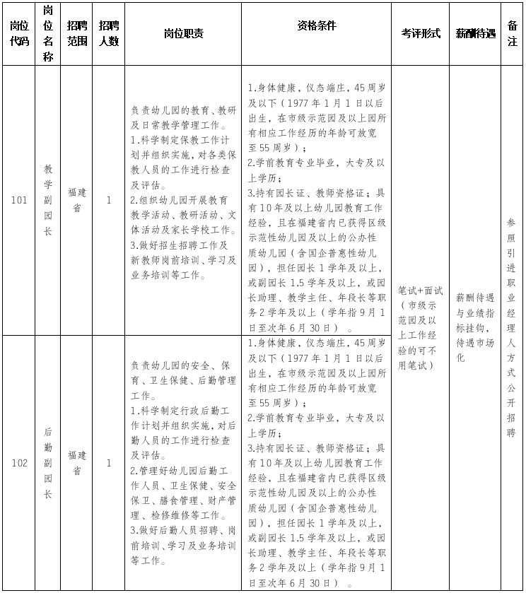 (一)根據(jù)幼兒園發(fā)展規(guī)劃,本次先行招聘2名副園長。根據(jù)考評情況,開園后其中一人可擬定副園長(主持工作),待一年期滿后經(jīng)考核,可視情況從中遴選園長1名。