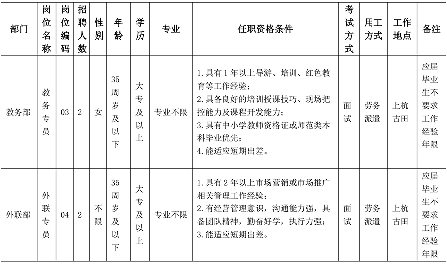 •   龍巖市圣地古田文化傳播有限公司是上杭縣屬一級國企上杭古田建設(shè)發(fā)展有限公司所屬全資子公司,是龍巖市人民政府批準同意設(shè)立的集革命傳統(tǒng)教育、理想信念教育及素質(zhì)拓展培訓(xùn)服務(wù)為一體的專業(yè)培訓(xùn)機構(gòu)。龍巖市圣地古田文化傳播有限公司依托古田及周邊地區(qū)的革命歷史資源和教學(xué)資源的優(yōu)勢,緊緊圍繞“不忘初心,牢記使命”這個主題,以堅定理想信念、加強黨性修養(yǎng)、錘煉優(yōu)秀作風(fēng)為目的,創(chuàng)造新的教學(xué)模式,形成一套完備豐富的教學(xué)模式體系。現(xiàn)因各公司業(yè)務(wù)拓展需要,決定面向社會公開招聘部分崗位工作人員,F(xiàn)將有關(guān)招聘事項公告如下: