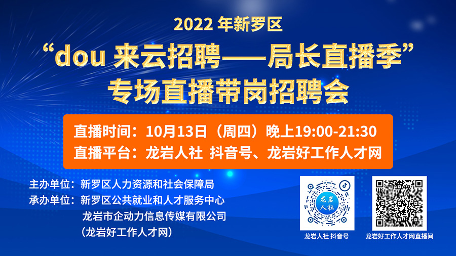 為積極搭建我區(qū)企業(yè)和高校畢業(yè)生、農(nóng)民工、退役軍人等各類求職群體對接交流平臺,吸引更多人才來到新羅、留在新羅、建功新羅,結(jié)合抖音平臺云招聘優(yōu)勢,新羅區(qū)人力資源和社會保障局?jǐn)M于2022年10月13日(星期四)晚上19:00-21:30舉辦2022 年新羅區(qū)“dou 來云招聘--局長直播季”專場直播帶崗招聘會。