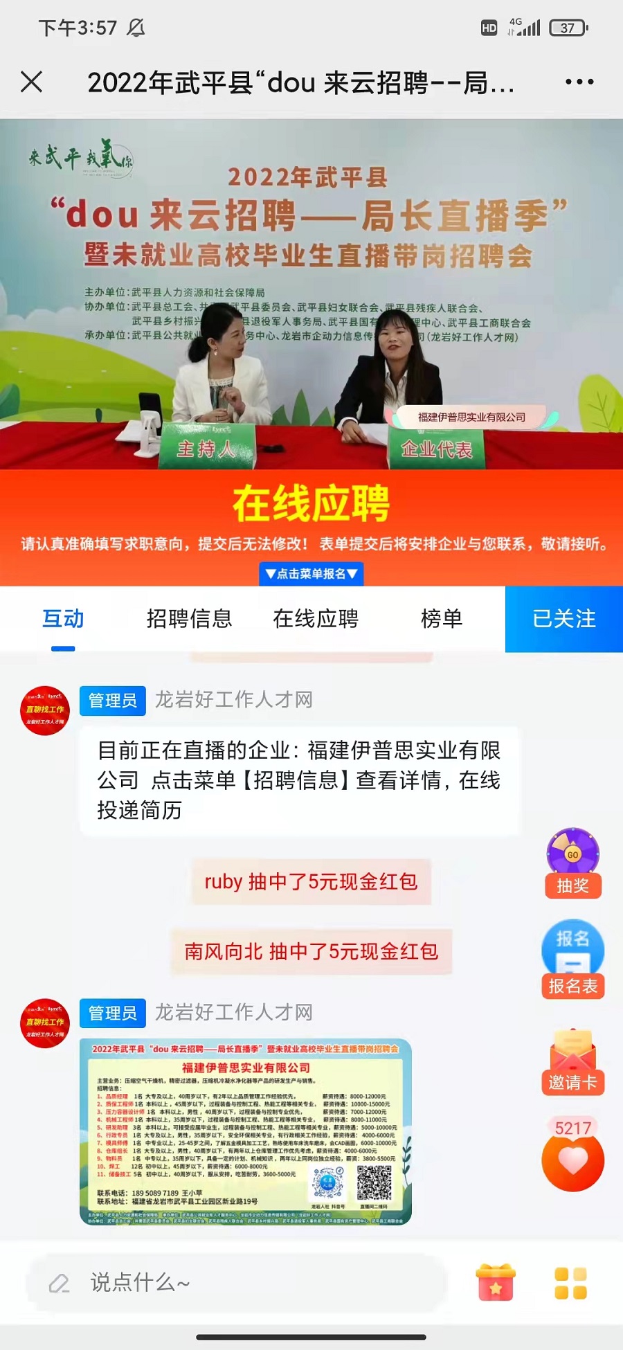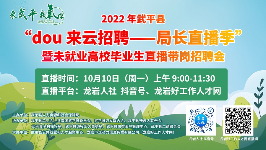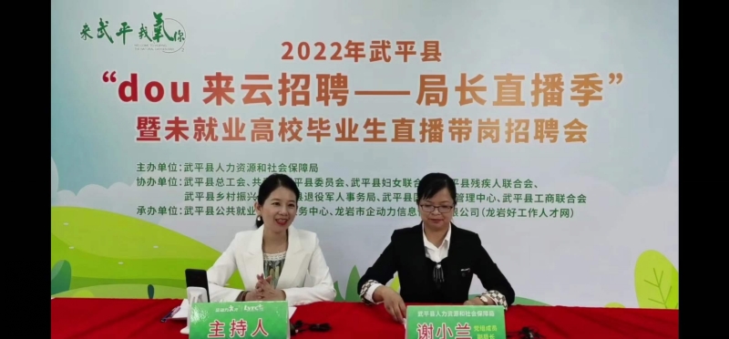 •  2022年10月10日,由武平縣人力資源和社會保障局主辦,武平縣公共就業(yè)人才服務中心及龍巖市企動力信息傳媒有限公司(龍巖企動力好工作人才網(wǎng))承辦的2022年武平縣“dou來云招聘 局長直播季”暨未就業(yè)高校畢業(yè)生直播帶崗招聘會圓滿完成。