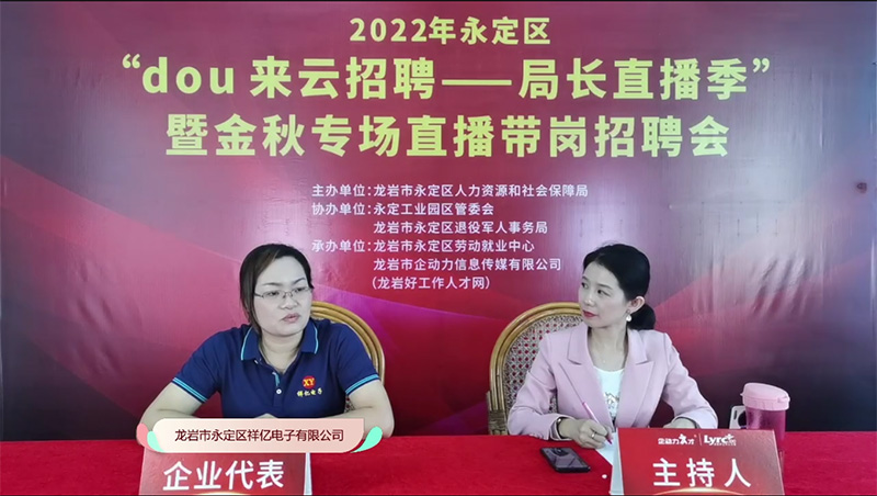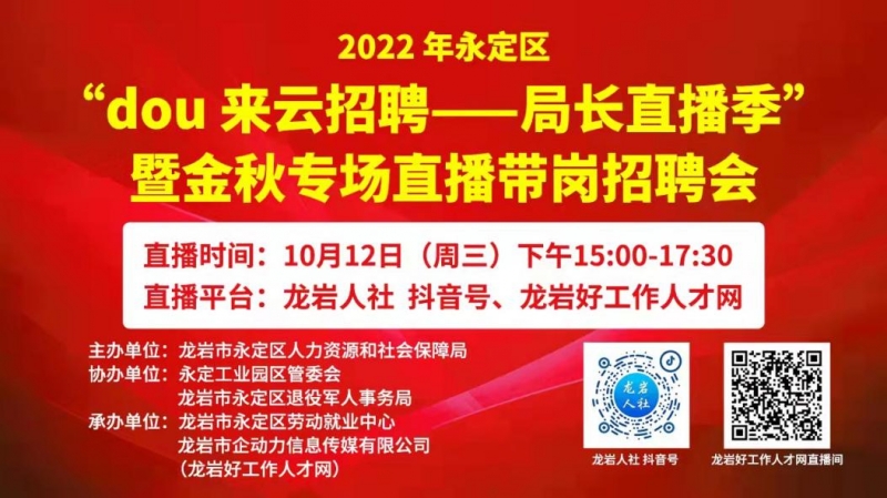 •  2022年10月12日下午,由龍巖市永定區(qū)人力資源和社會保障局主辦,永定工業(yè)園區(qū)管委會、龍巖市永定區(qū)退役軍人事務局協(xié)辦,龍巖市永定區(qū)勞動就業(yè)服務中心及龍巖市企動力信息傳媒有限公司(龍巖好工作人才網(wǎng))承辦的2022年永定區(qū)“dou來云招聘 局長直播季”暨金秋專場直播帶崗招聘會圓滿完成。
