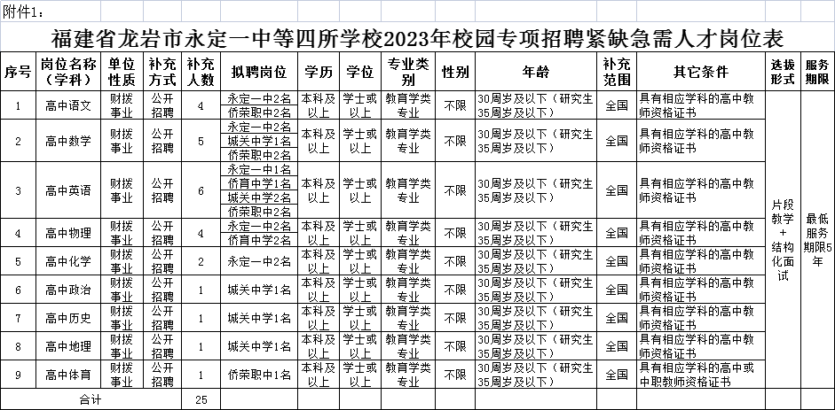 招聘學(xué)校包含永定第一中學(xué)、永定區(qū)城關(guān)中學(xué)、永定區(qū)僑育中學(xué)、永定區(qū)僑榮職業(yè)中專學(xué)校。崗位及人數(shù):高中語文4名、高中數(shù)學(xué)5名、高中英語6名、高中物理4名、高中化學(xué)2名、高中政治1名、高中歷史1名、高中地理1名、高中體育1名,合計25名。具體招聘崗位、人數(shù)及資格條件等詳見《福建省龍巖市永定一中等四所學(xué)校2023年校園專項(xiàng)招聘緊缺急需人才崗位表》(附件1)。