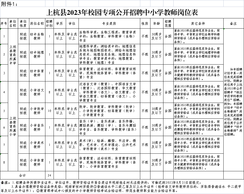 3.應聘人員應為2023年應屆師范類本科及以上畢業(yè)生(研究生學歷報考人員其本科或研究生階段有一個學歷層次為師范類專業(yè)),并符合《上杭縣2023年校園公開招聘中小學教師崗位表》(附件1)所要求的相關條件。