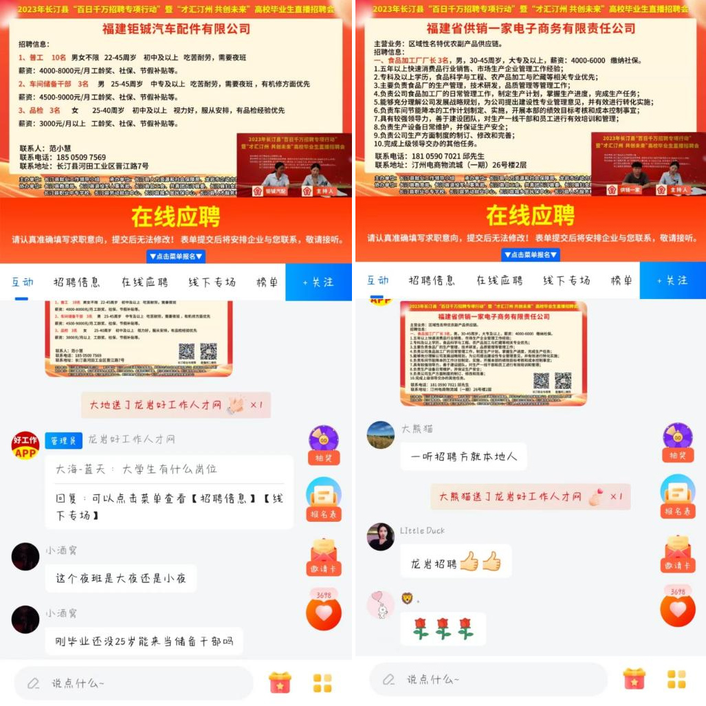 •   為促進(jìn)高校畢業(yè)生返鄉(xiāng)就業(yè),幫助廣大用人單位吸納更多高校人才,7月8日,由長汀縣就業(yè)工作領(lǐng)導(dǎo)小組主辦,長汀縣人力資源和社會保障局、龍巖市企動力信息傳媒有限公司(龍巖好工作人才網(wǎng))承辦,長汀縣教育局、長汀縣退役軍人事務(wù)局、長汀縣總工會、共青團(tuán)長汀縣委、長汀縣婦女聯(lián)合會、長汀縣殘疾人聯(lián)合會、長汀縣職業(yè)中專學(xué)校、長汀縣勞動就業(yè)中心、長汀縣城鄉(xiāng)居民保中心、長汀縣人才服務(wù)和職業(yè)技能鑒定中心協(xié)辦的2023年長汀縣“百日千萬招聘專項行動”暨“才匯汀州 共創(chuàng)未來”高校畢業(yè)生直播招聘會圓滿舉辦。