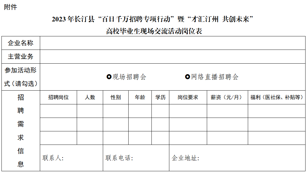 4.于2023年7月5日18時(shí)前填寫(xiě)《2023年長(zhǎng)汀縣“百日千萬(wàn)招聘專項(xiàng)行動(dòng)”暨“才匯汀州 共創(chuàng)未來(lái)”高校畢業(yè)生現(xiàn)場(chǎng)交流活動(dòng)崗位表》(見(jiàn)附件),以電子郵件形式發(fā)送至郵箱:yinrendaren@163.com。