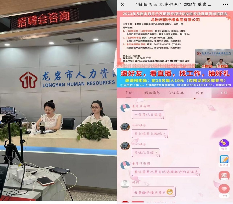 •   8月24日,由龍巖市人力資源和社會(huì)保障局、龍巖市婦女聯(lián)合會(huì)主辦,龍巖市總工會(huì)、龍巖市新羅區(qū)婦女聯(lián)合會(huì)協(xié)辦,龍巖市公共就業(yè)和人才服務(wù)中心、龍巖市企動(dòng)力信息傳媒有限公司(龍巖好工作人才網(wǎng))承辦的“福在閩西 職等你來(lái)”2023年龍巖市百日千萬(wàn)招聘專(zhuān)項(xiàng)行動(dòng)女性專(zhuān)場(chǎng)直播帶崗招聘會(huì)成功舉辦。