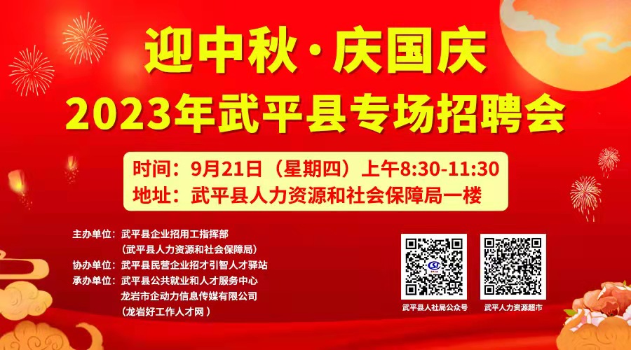 • 【9月21日武平】“迎中秋 慶國慶”2023年武平縣專場招聘會公告