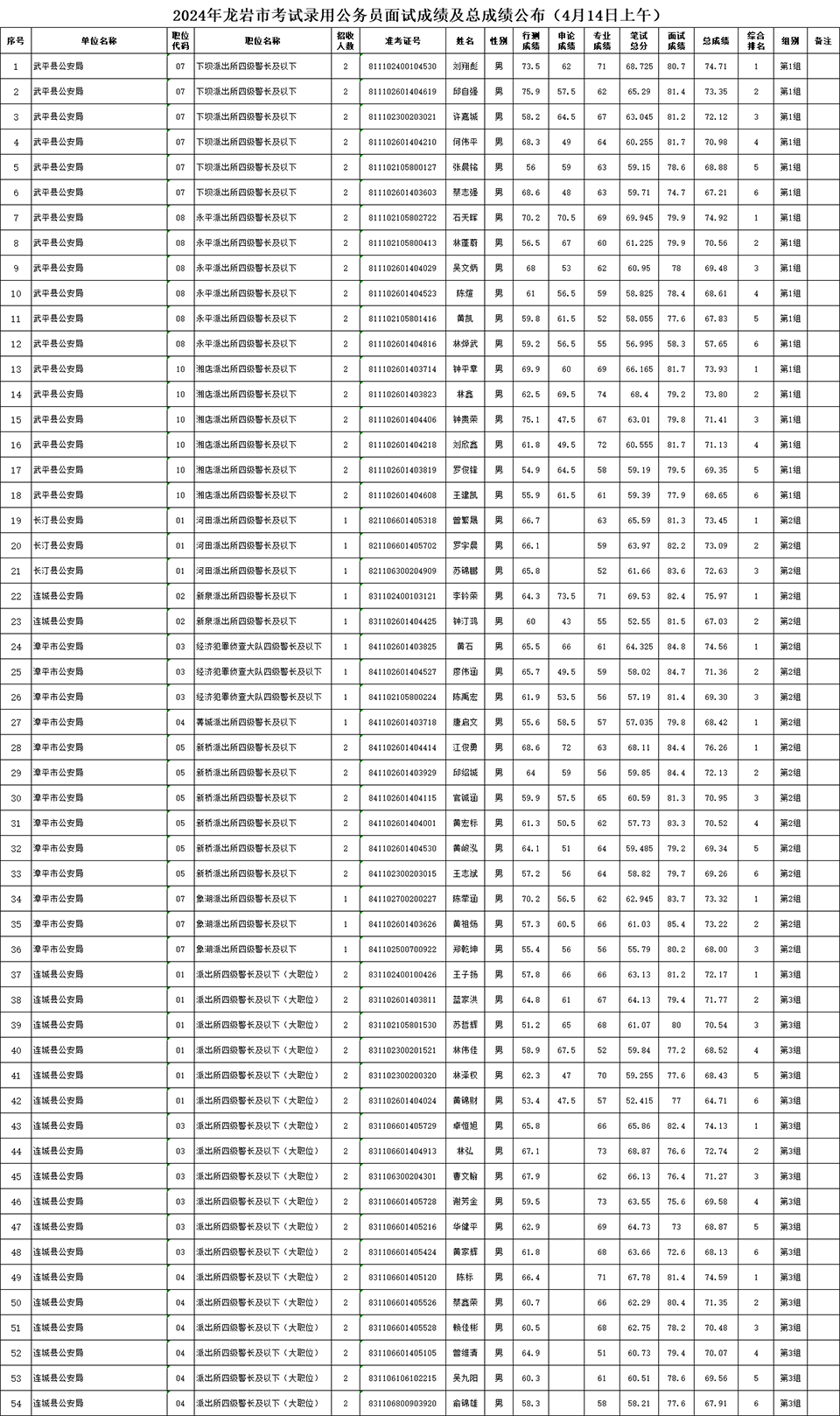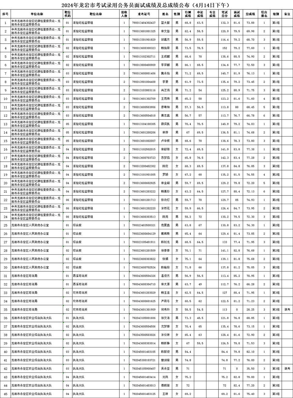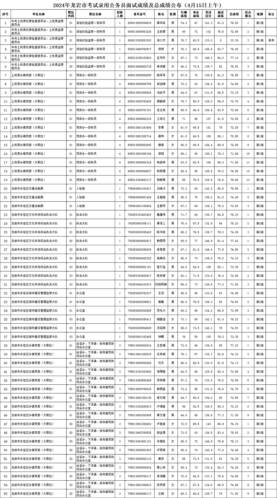 您當(dāng)前的位置:首頁 > 新羅區(qū)國有企事業(yè) > 2024年龍巖市考試錄用公務(wù)員面試成績及總成績公布【匯總4月13日-4月15日】