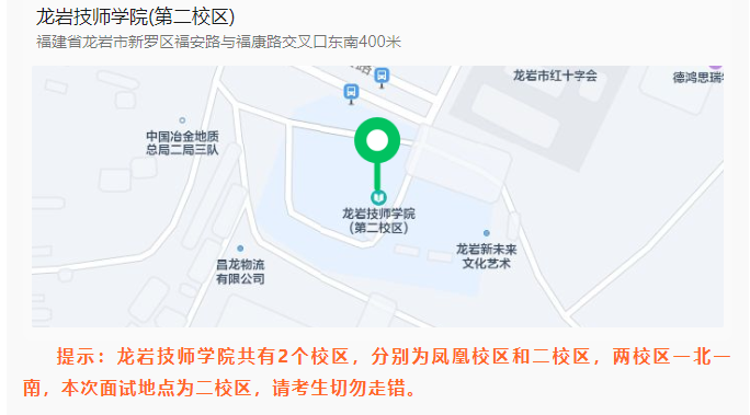 提示:龍巖技師學(xué)院共有2個(gè)校區(qū),分別為鳳凰校區(qū)和二校區(qū),兩校區(qū)一北一南,本次面試地點(diǎn)為二校區(qū),請(qǐng)考生切勿走錯(cuò)。