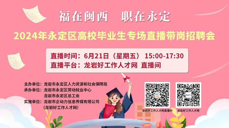 •   為深入貫徹黨的二十大精神,落實黨中央、國務院和省委、省政府關(guān)于做好高校畢業(yè)生就業(yè)工作部署,全方位推動精準就業(yè)服務,建立企業(yè)與求職者之間的供需對接平臺,有效促進高校畢業(yè)生等青年群體就業(yè)創(chuàng)業(yè)工作,滿足企業(yè)用工需求,龍巖市永定區(qū)人力資源和社會保障局現(xiàn)決定舉辦“福在閩西 職在永定”2024年永定區(qū)高校畢業(yè)生專場直播帶崗招聘會。