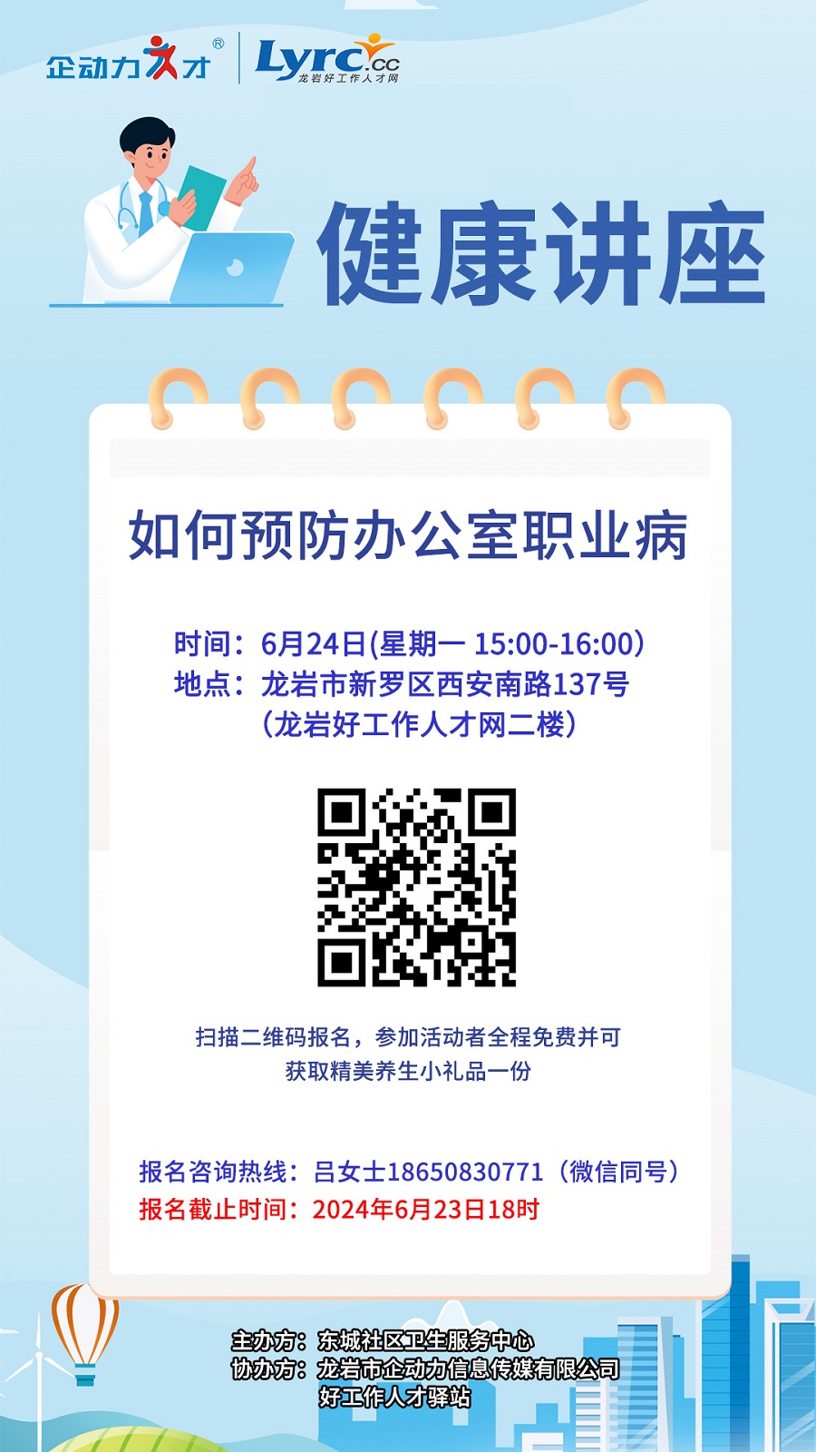 鑒于當前辦公室員工普遍面臨各種職業(yè)健康問題,如視力疲勞、頸椎病、腰椎勞損等,為了提高辦公室職場人員的健康意識,掌握正確的健康保障方法,從而提高工作和生活質(zhì)量,故擬計劃于6月24日在龍巖好工作人才網(wǎng)二樓開展《如何預(yù)防辦公室職業(yè)病》的健康知識講座。