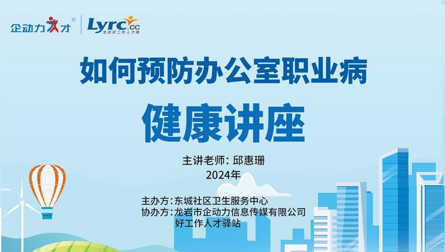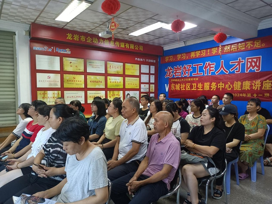 •   6月24日下午,由龍巖市企動(dòng)力信息傳媒有限公司、好工作人才驛站聯(lián)合東城社區(qū)衛(wèi)生服務(wù)中心共同舉辦的《如何預(yù)防辦公室職業(yè)病》公益健康知識(shí)講座在龍巖好工作人才網(wǎng)二樓成功舉辦。此次吸引了眾多上班族和對(duì)養(yǎng)生感興趣的中老年人前來參加。