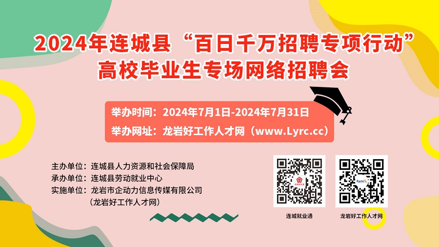 • 2024年連城縣“百日千萬招聘專項行動”高校畢業(yè)生專場網絡招聘會