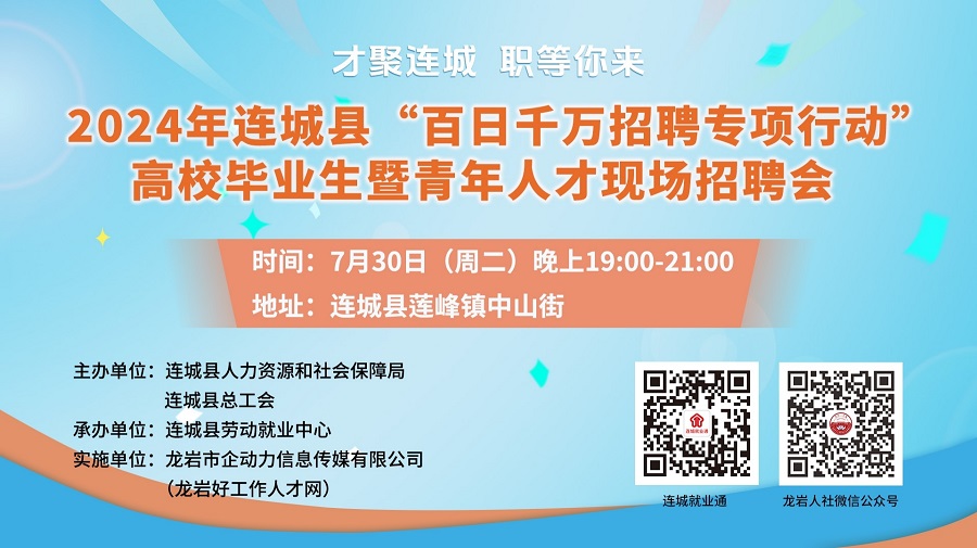 您當(dāng)前的位置:首頁 > 新聞動態(tài) > 【7月30日】2024年連城縣“百日千萬招聘專項行動”高校畢業(yè)生暨青年人才現(xiàn)場招聘會