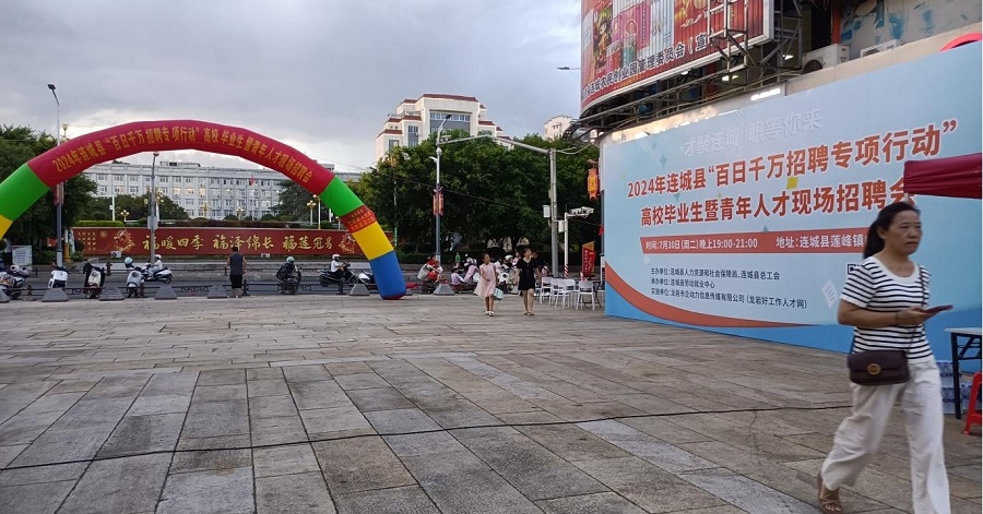 •   為深入貫徹落實(shí)黨中央、國務(wù)院關(guān)于促進(jìn)高校畢業(yè)生等青年就業(yè)工作決策部署,強(qiáng)化高校畢業(yè)生等青年群體就業(yè)服務(wù),暢通求職招聘渠道,連城縣人力資源和社會(huì)保障局定于2024年7月30日晚上舉辦的“才聚連城 職等你來”2024年連城縣“百日千萬招聘專項(xiàng)行動(dòng)”高校畢業(yè)生暨青年人才現(xiàn)場(chǎng)招聘會(huì)在連城縣蓮峰鎮(zhèn)中山街廣場(chǎng)成功舉辦。