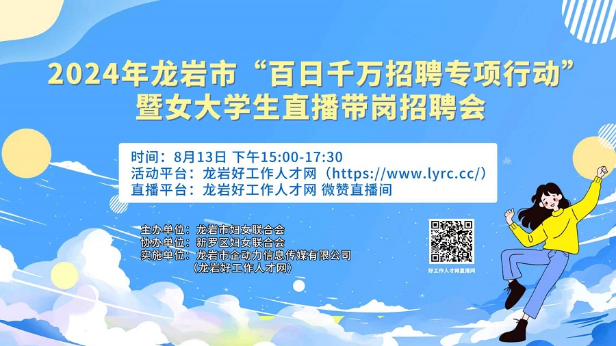 2024年8月13日舉辦2024年龍巖市“百日千萬招聘專項行動”暨女大學(xué)生直播帶崗招聘會