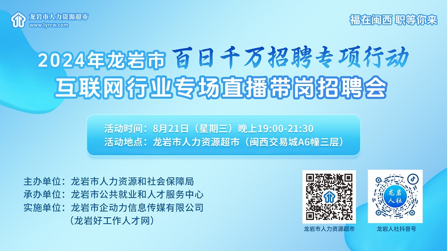 • 【直播回放】 “福在閩西 職等你來(lái)”2024年龍巖市百日千萬(wàn)招聘專項(xiàng)行動(dòng)互聯(lián)網(wǎng)行業(yè)專場(chǎng)直播帶崗招聘會(huì)