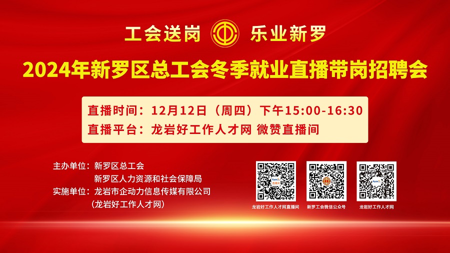 為深入貫徹黨中央、國務(wù)院關(guān)于“促進高質(zhì)量充分就業(yè)”的決策部署,幫助各類企業(yè)招工穩(wěn)崗,搭建我市企業(yè)與求職者的供需對接平臺,新羅區(qū)總工會定于2024年12月12日(星期四)下午15:00-17:00舉辦“工會送崗 樂業(yè)新羅”2024年新羅區(qū)總工會冬季就業(yè)直播帶崗招聘會。