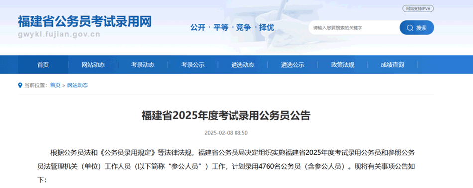根據(jù)公務(wù)員法和《公務(wù)員錄用規(guī)定》等法律法規(guī),福建省公務(wù)員局決定組織實(shí)施福建省2025年度考試錄用公務(wù)員和參照公務(wù)員法管理機(jī)關(guān)(單位)工作人員(以下簡(jiǎn)稱“參公人員”)工作,計(jì)劃錄用4760名公務(wù)員(含參公人員),F(xiàn)將有關(guān)事項(xiàng)公告如下: