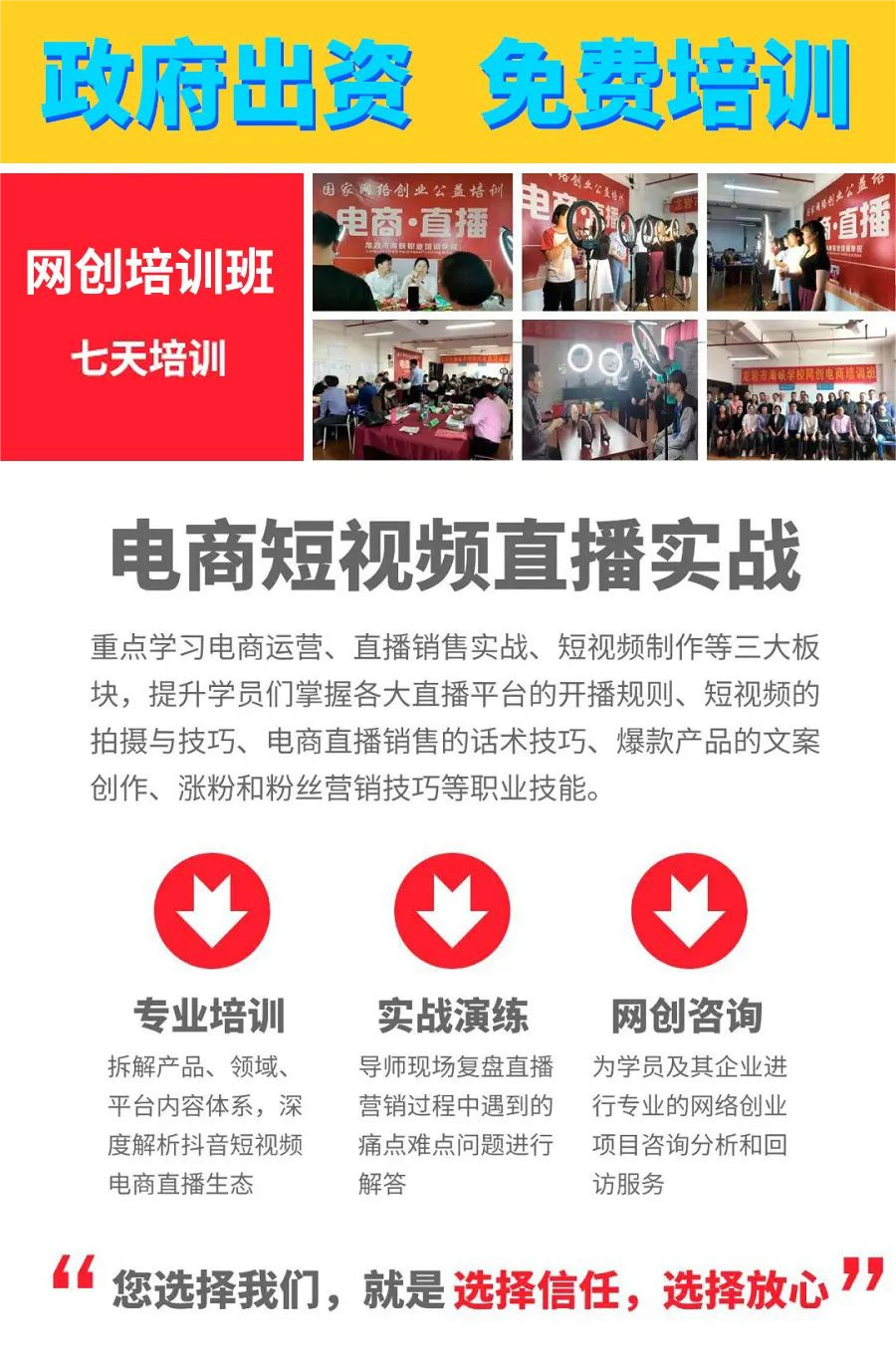 想學(xué)習(xí)及想要提升直播帶貨能力的人群;現(xiàn)在就有一個(gè)好機(jī)會(huì)!報(bào)名學(xué)習(xí)網(wǎng)絡(luò)創(chuàng)業(yè)培訓(xùn)課程!培訓(xùn)地點(diǎn):龍巖市新羅區(qū)羅龍西路165號(hào)格朵國(guó)際大酒店三樓。